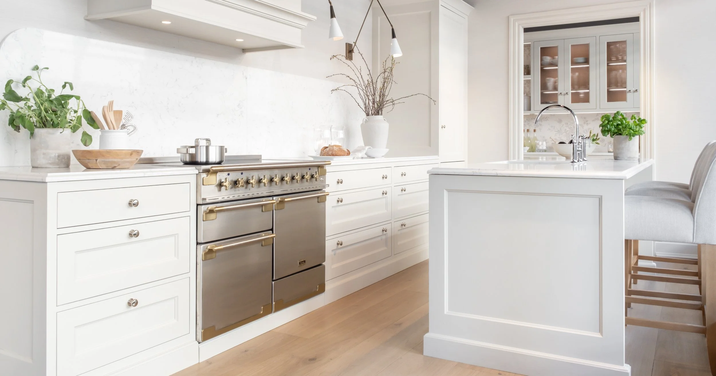Det Nordiske trekjøkkenet består av nøye utvalgte og varme materialer, som beiset eik og lyse benkeplater, i kombinasjon med gulv i grå betong, en elegant kontrast til veggene som er malt i lyse nyanser. Oppdag smarte skap med "pocket door"-løsning som effektiviserer oppbevaringen. Bak de lukkede dørene skjuler det seg en kaffestasjon. Skapene er ikke bare funksjonelle, de strammer opp uttrykket med vakre linjer i designet når dørene er lukket. De ryddige og harmoniske detaljene finner man igjen i husets øvrige arkitektur og uttrykk.