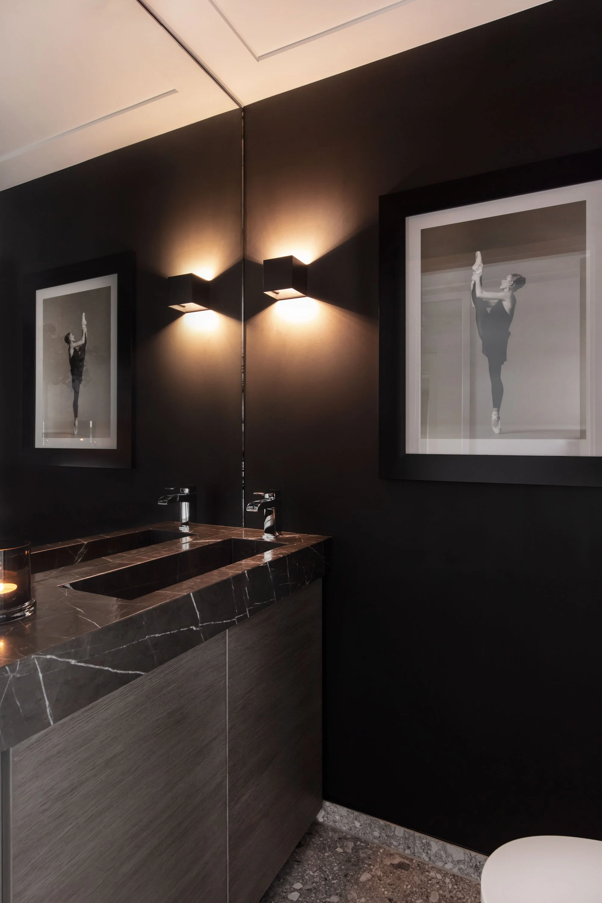 Elegant toalett og hall på Frogner med eksklusive materialer som marmor, terrazzo og stålbørstet treverk. Les mer her.