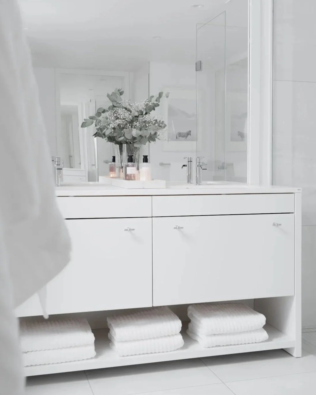 Et lyst og elegant bad med dobbel servant, kromdetaljer og praktisk hylle for håndklær. Les mer her.