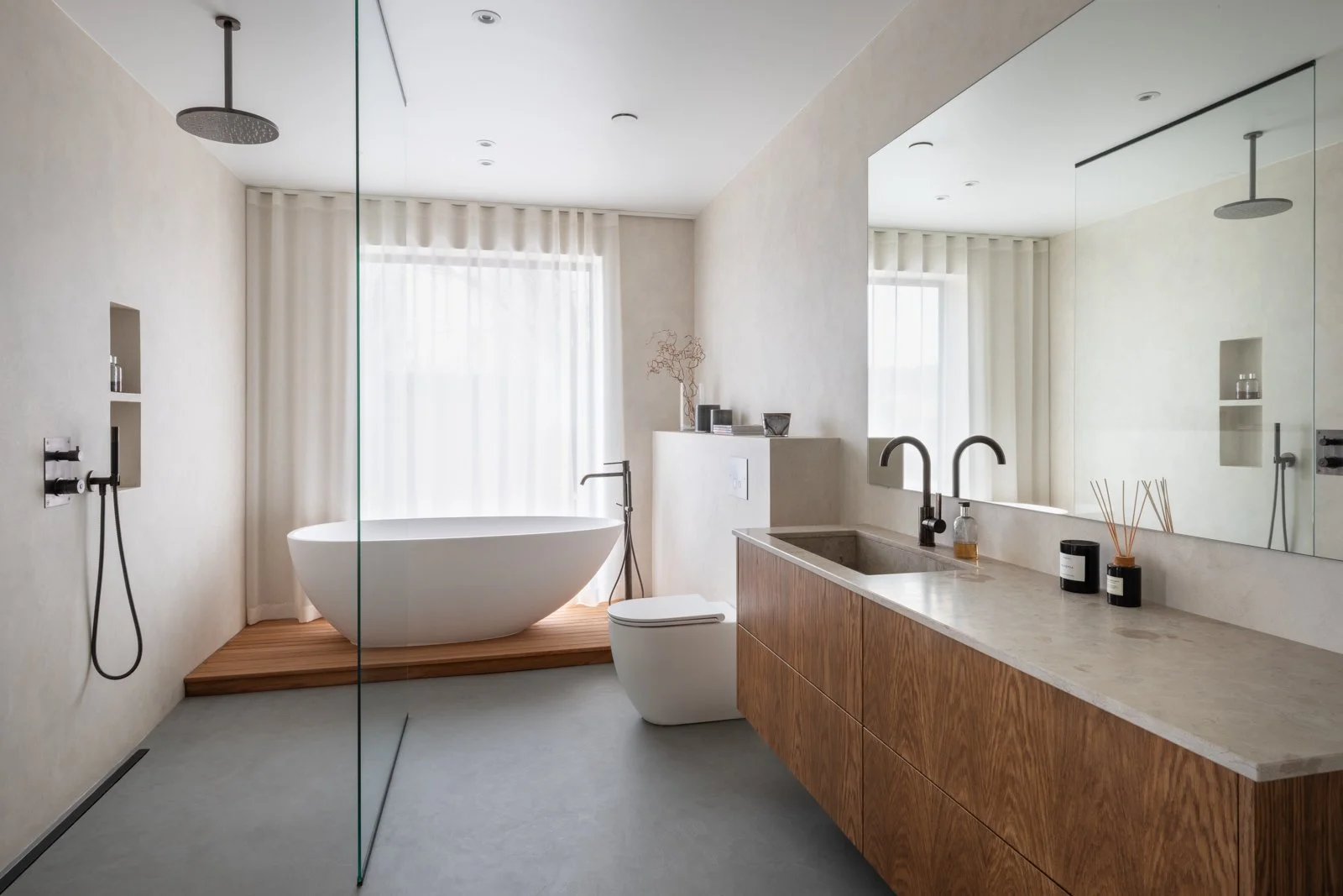 Baderom med mørkbeiset tre, lyse naturtoner og mye naturlig lys – elegant, rolig og gjennomført. Les mer her.