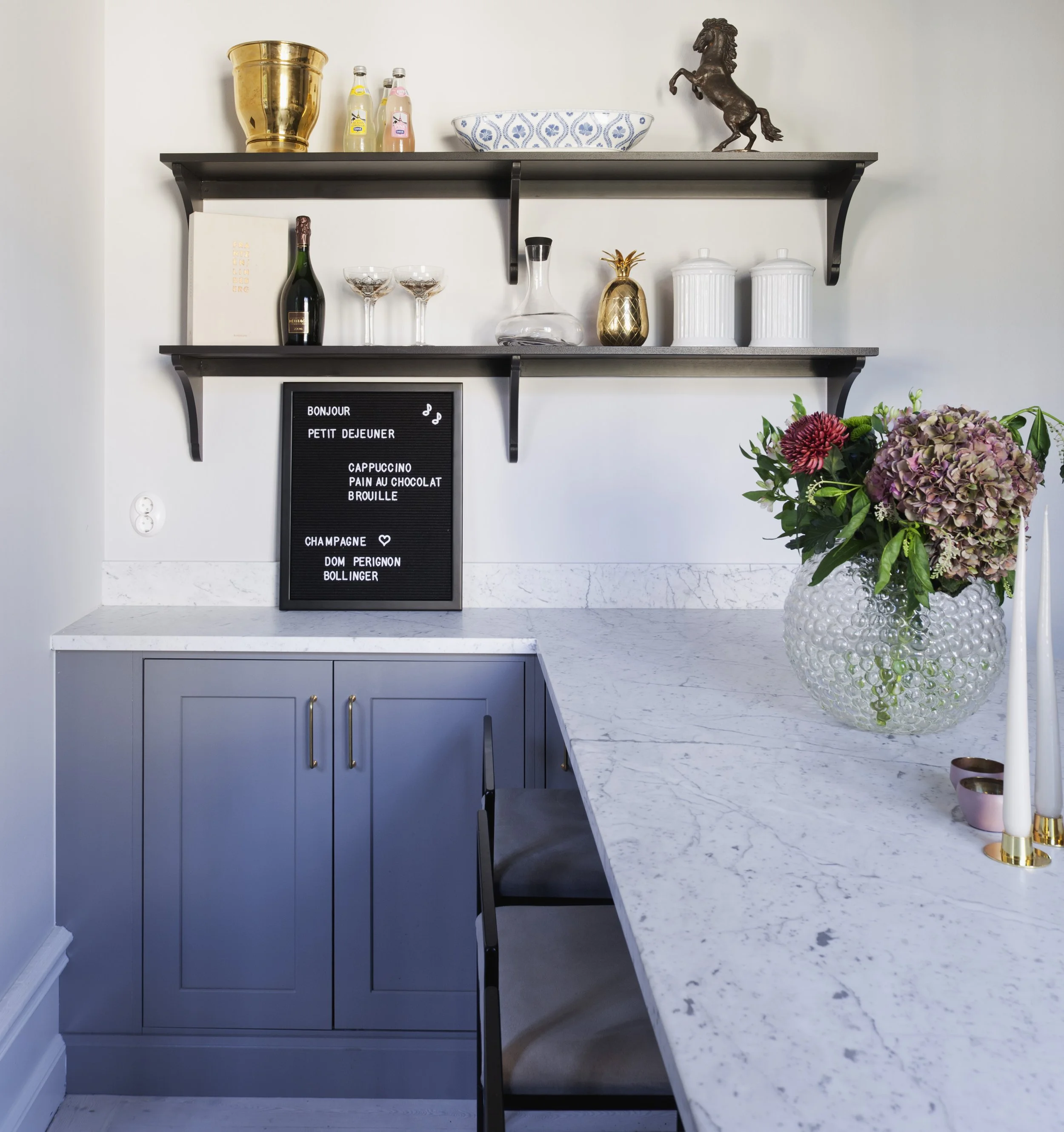 Her møtes funksjon og personlighet i et kjøkken som oser av særpreg og gjennomtenkte løsninger. Den blåmalte askefineren gir dybde og karakter, og den fremtrukne sokkelen skaper et solid og møbelpreget uttrykk, i dette klassiske shaker-kjøkkenet. Messingdetaljene – både på håndtak og kjøkkenkran – tilfører varme og et snev av eleganse som balanserer det moderne med det klassiske.
