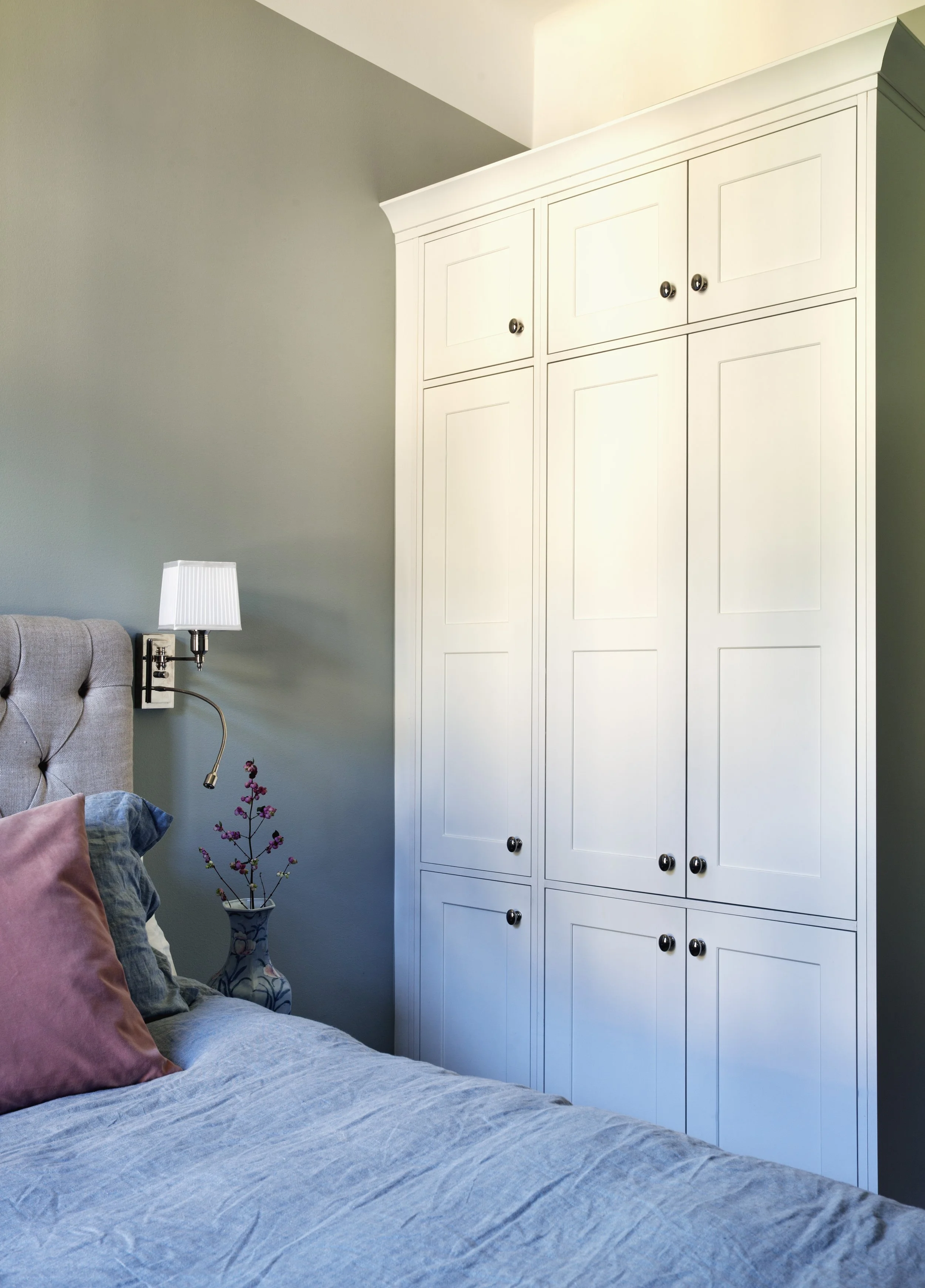 I samme stil er det laget en garderobe i hvitt på soverommet – med god høyde og klassiske knotter – som binder hjemmets ulike rom sammen. Detaljene er like nøye valgt her som på kjøkkenet, og resultatet er en helhet som kjennes harmonisk og tidløs.
