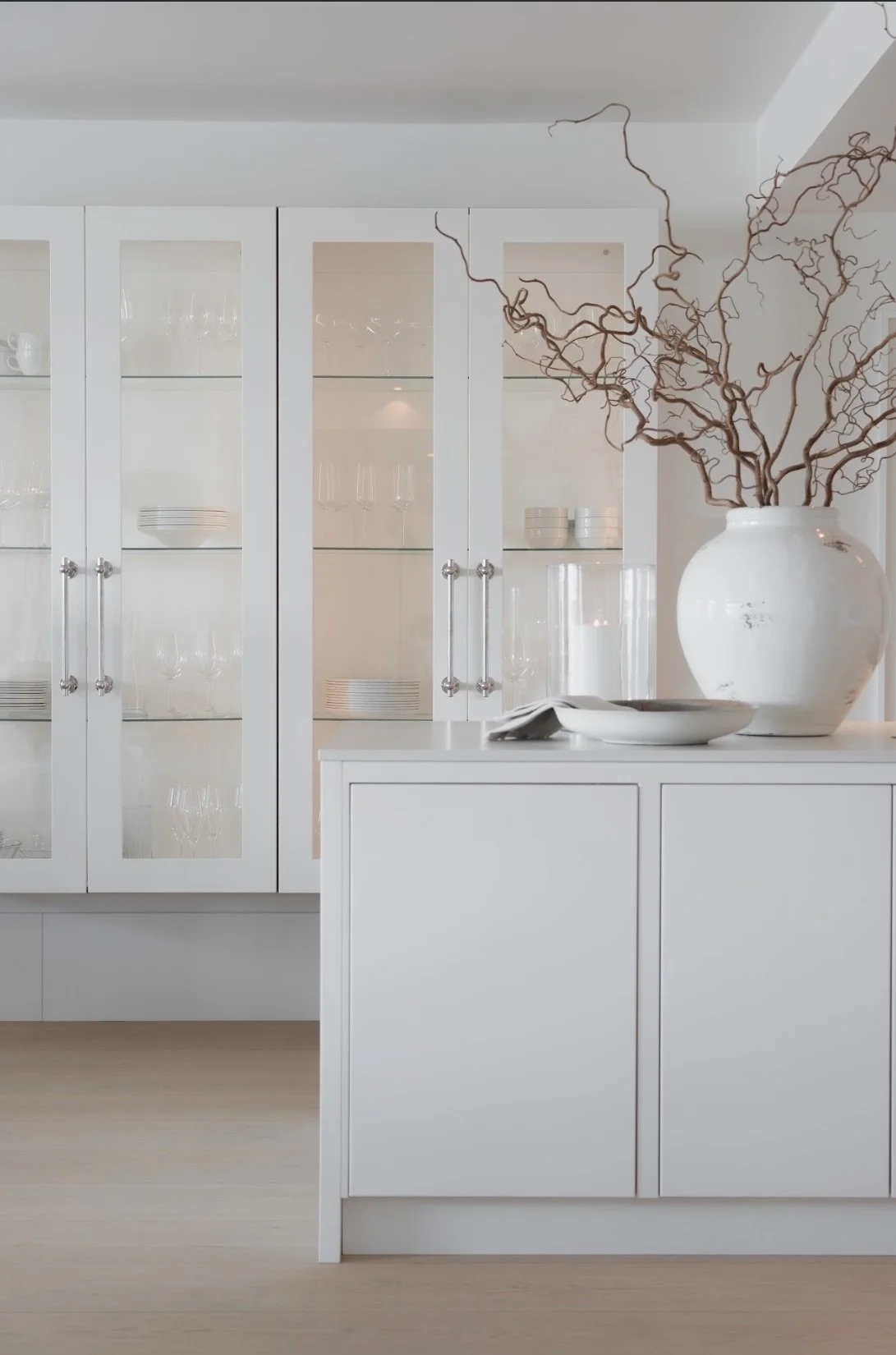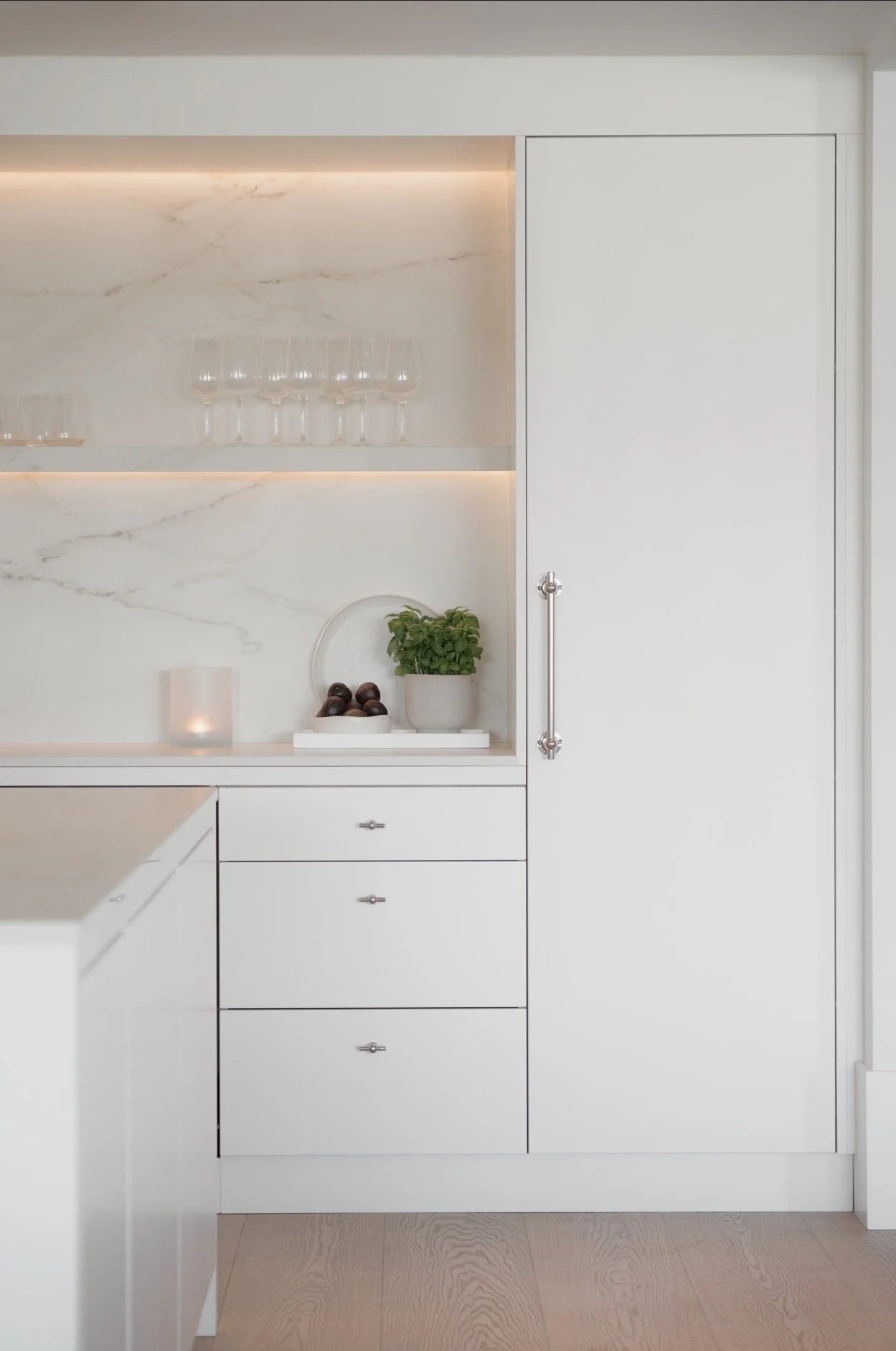 Det klassiske møter det moderne i balanserte kontraster – fra de kraftige håndtakene i krom med tradisjonelt uttrykk, til benkeplaten i kompositt som tilfører klassisk karakter med marmormønster som har lange, markante årer. De vegghengte vitrineskapene med innvendig belysning som gir en lun glød og fremhever alt fra porselen til glass.