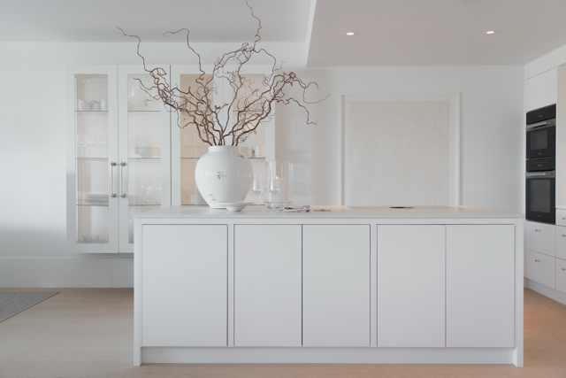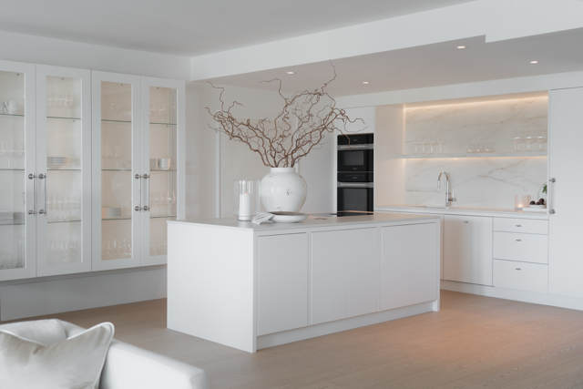 I dette lyse og tidløse kjøkkenet er det valgt slette fronter i hvitmalt MDF, som er både praktisk og som gir et rent, dust utrykk på kjøkkenet.
