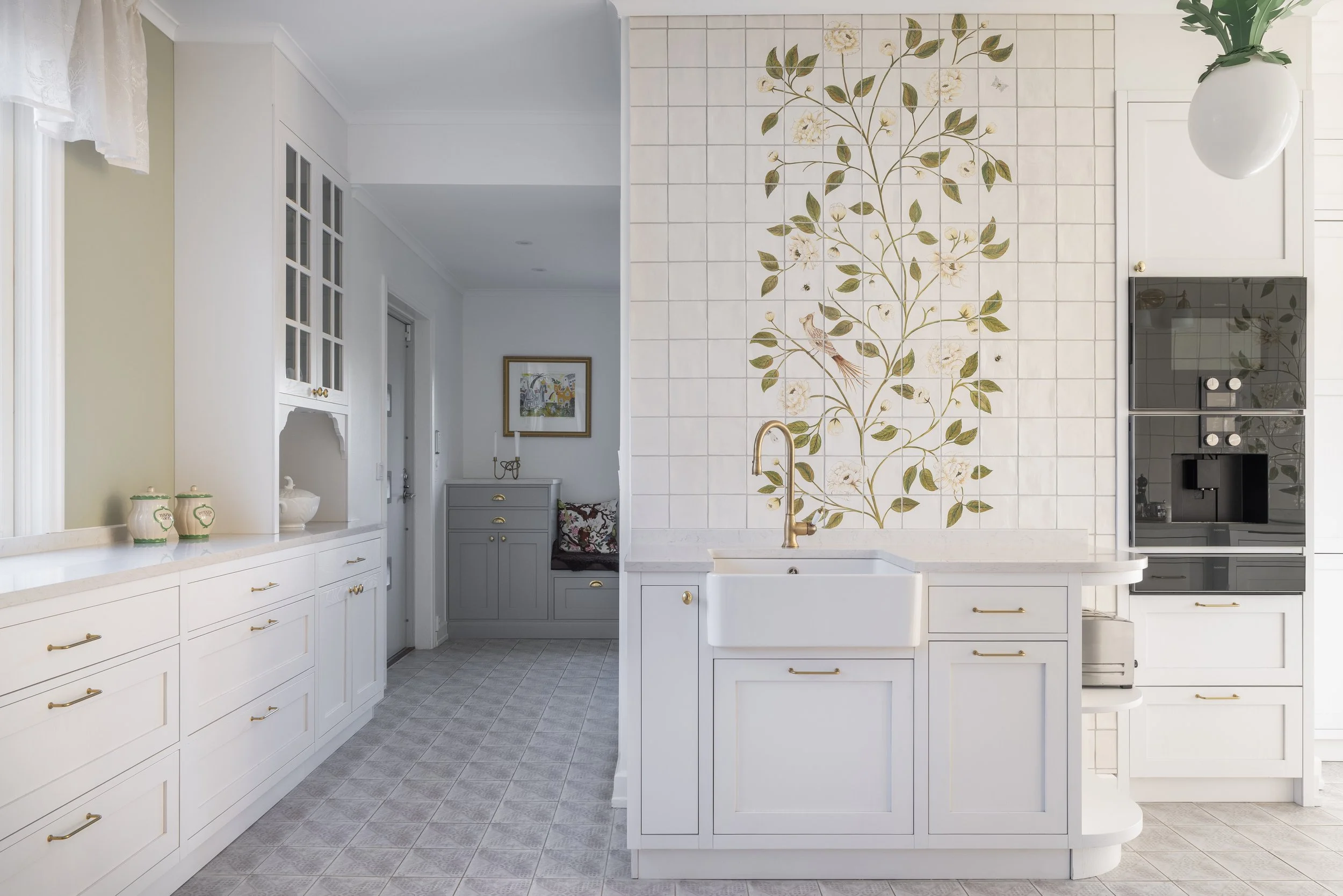 Dette kjøkkenet er et vakkert eksempel på tidløs, landlig stil med et klassisk uttrykk. Frontene er malt i en ren hvit tone, med brede rammer som gir kjøkkenet karakter og dybde. Bak de elegante vitrineskapene skjuler det seg en uventet detalj – en nydelig grønnmalt innside som gir en frisk kontrast og et eksklusivt preg.