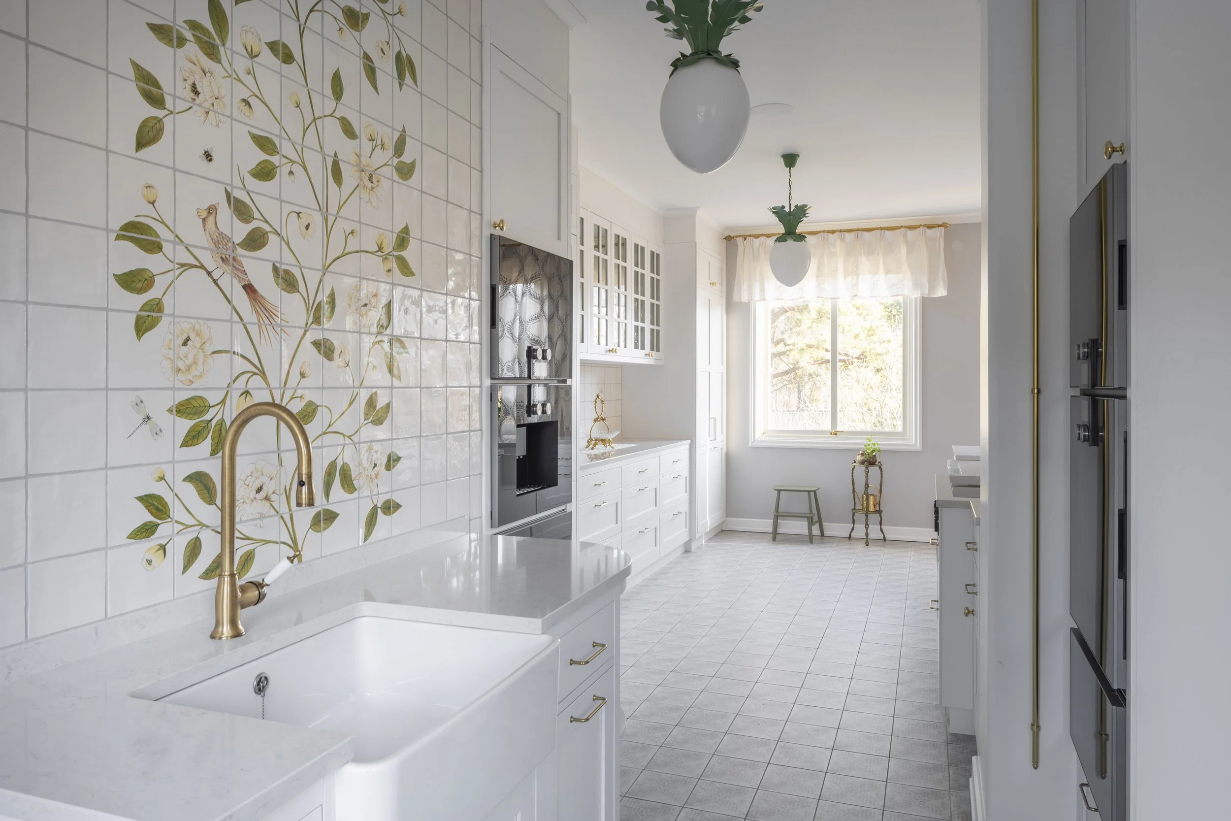 For å fullføre uttrykket er kjøkkenet utstyrt med hvitevarer fra Gaggenau, kjent for sine eksklusive løsninger og kompromissløse kvalitet. Resultatet er et kjøkken som ikke bare er funksjonelt, men som også løfter hjemmets estetikk – et rom hvor tradisjonelt håndverk møter moderne luksus.