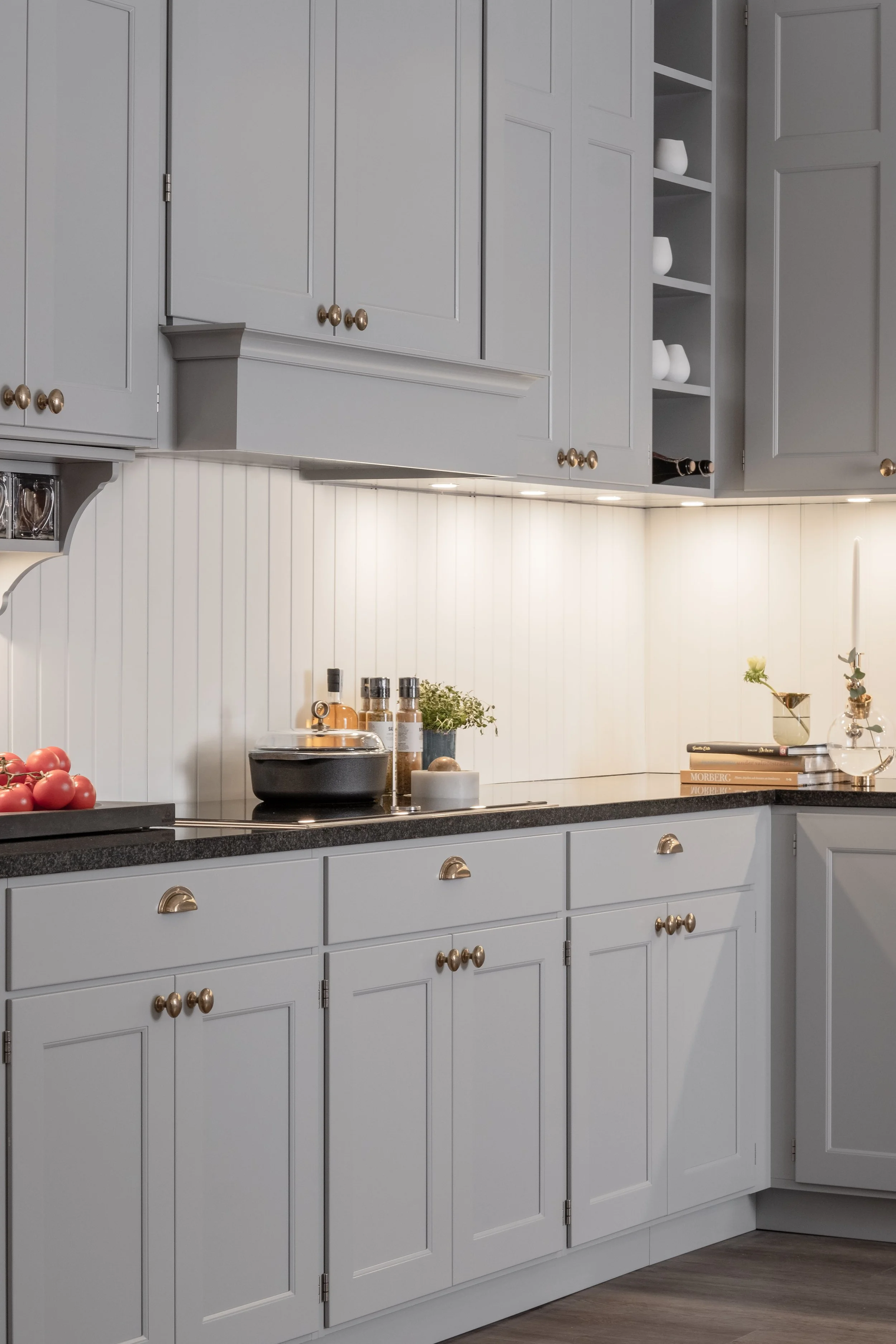 Dette klassiske kjøkkenet balanserer stil og funksjon med en følelse av varig kvalitet. Frontene har en overfals, som vil si at frontene delvis skjuler skrogene, og synlige hengsler, noe som gir rommet et tradisjonelt uttrykk med et snev av håndverksfølelse. Den lyse grå fargen tilfører kjøkkenet en rolig og elegant base, mens de varme messingknottene, samt vask og kran i samme farge, gir karakter og et hint av nostalgi.